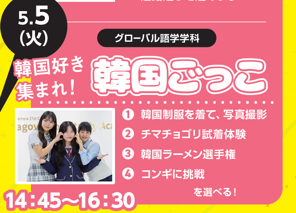K-POPや韓国文化は日本でも人気の高いコンテンツであり、エンタメや飲食業界などの韓国企業も続々と日本に進出してきています。英語・韓国語コースでは、基礎英語を学びながら韓国語や韓国文化・風習を学べるカリキュラムを設置し、韓国企業や韓国に関する業界への就職を目指します。